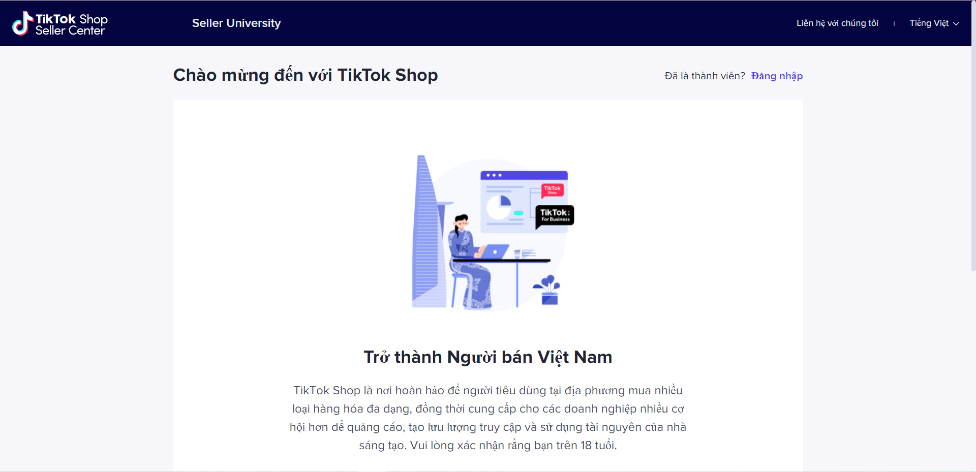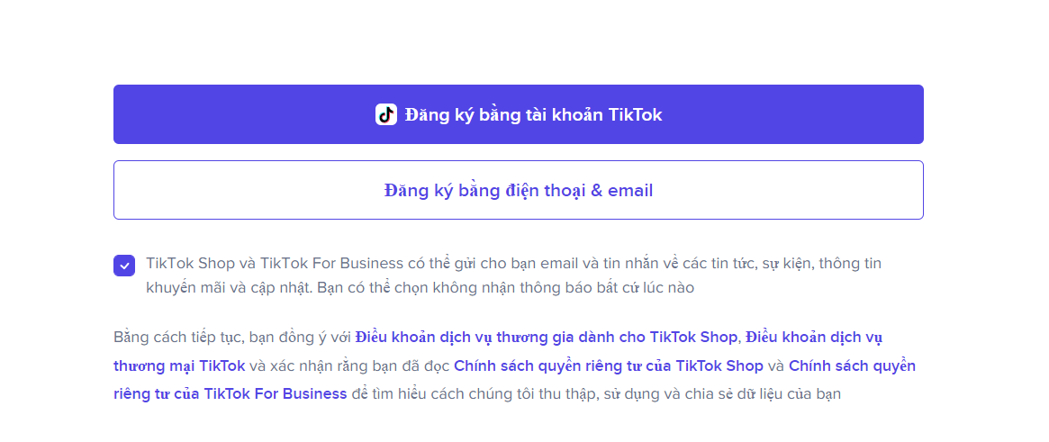 Bạn vào trang trung tâm người bán của TikTok shop để tạo tài khoản, có hai các đăng ký tiktok shop, đó là đăng ký bằng tài khoản tiktok và đăng kí bằng điện thoại và email.