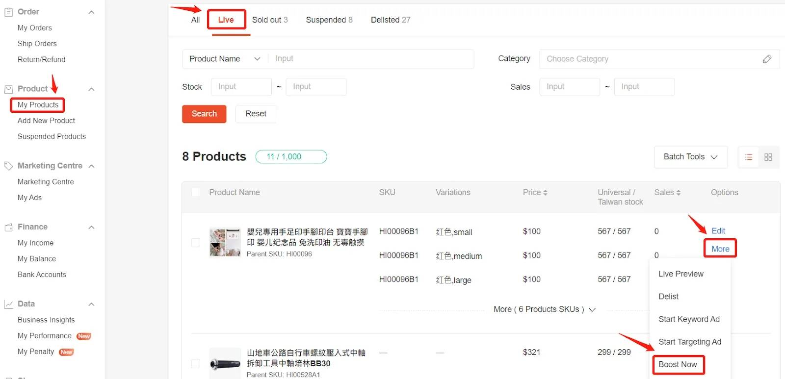 On the [My Products] product page, click [Live] to view the products for sale online. Click [Boost Now] in [More operations] to top the products, 5 SKUs can be exposed each time every 4 hours.