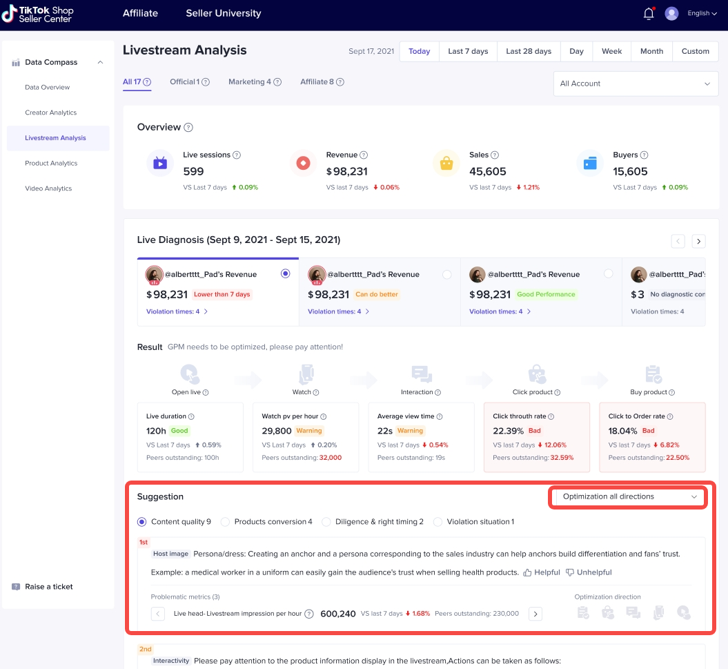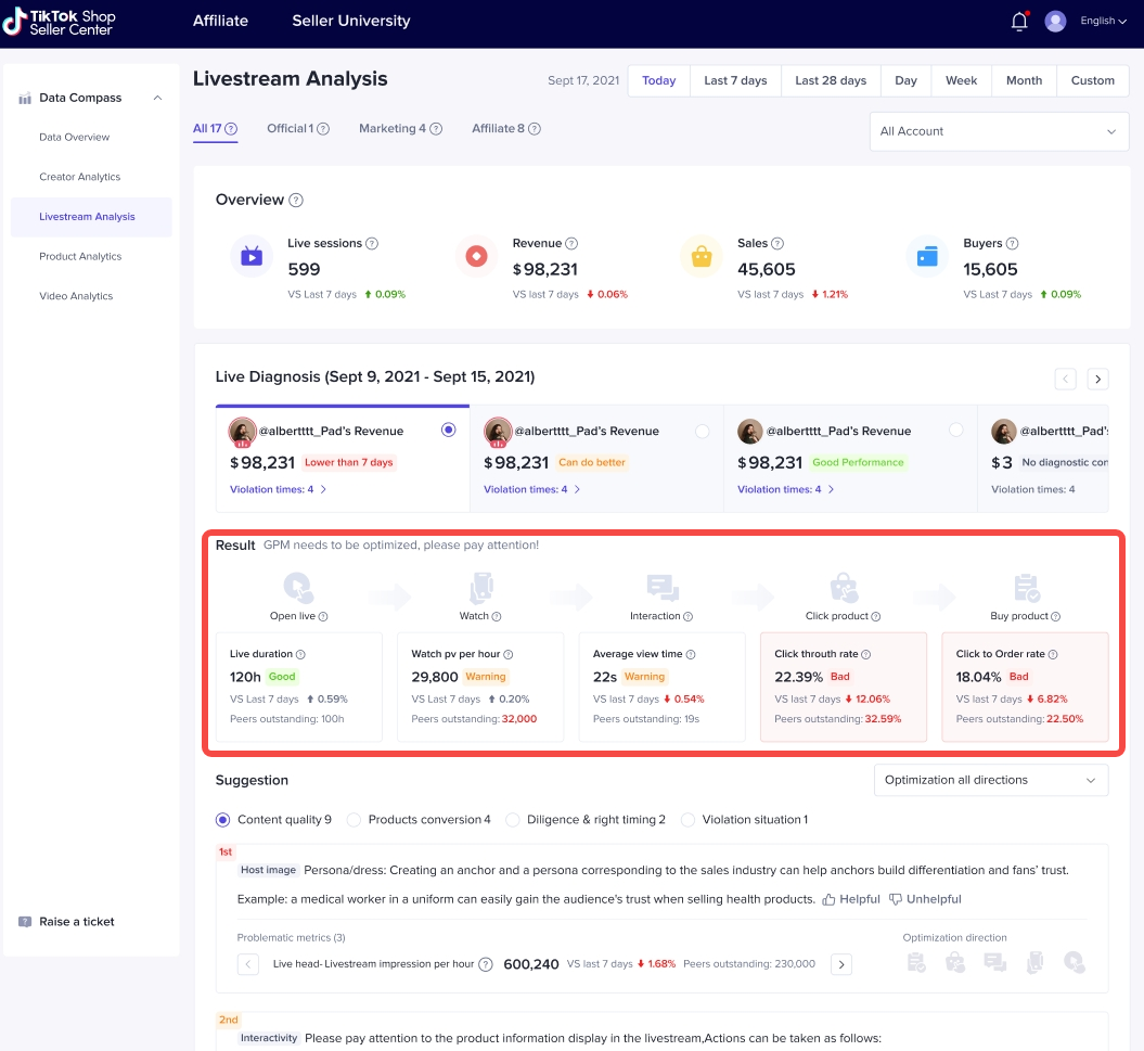 卖家中心的直播诊断能够帮助商家直观看到店铺绑定账号(官方账号+渠道账号)在近段时间的直播表现,从流量获取和流量转化2方面帮助商家定位直播问题,并给出诊断建议,商家可以根据建议调整直播策略,提升直播整体表现。