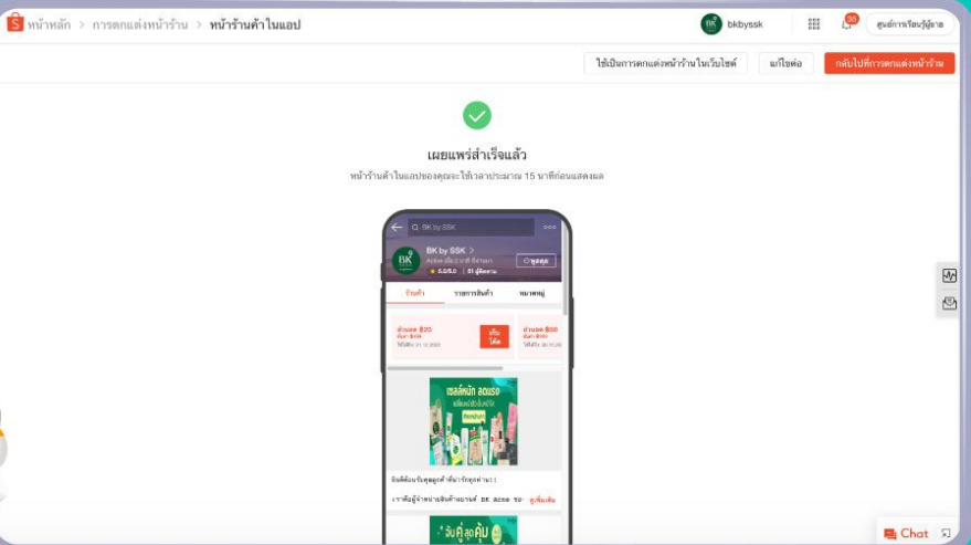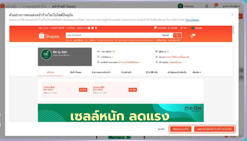 8、ตรวจดูตัวอย่างหน้าร้าน และเลือก เผยแพร่ไปยังหน้าร้านในเว็บไซต์ เป็นอันเสร็จเรียบร้อยสำหรับการตกแต่งหน้าร้าน