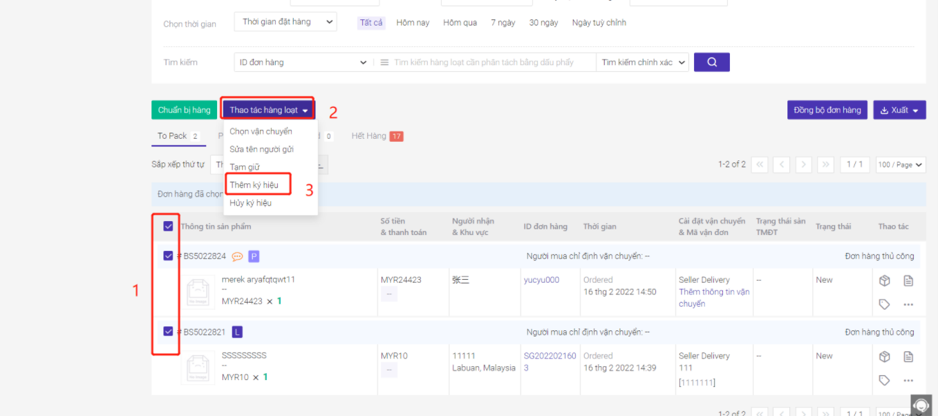 Bạn có thể tùy chỉnh cài đặt ký hiệu và thêm ký hiệu cho đơn hàng để phân biệt đơn hàng, giúp bạn có thể lọc ra đơn hàng nhanh chóng. Số lượng ký hiệu đơn hàng tối đa có thể cài đặt 10 cái, và tên ký hiệu không thể trùng lặp. Một đơn hàng có thể thêm nhiều ký hiệu, bạn có thể thêm/hủy ký hiệu (chỉnh sửa từng sản phẩm hoặc sửa hàng loạt) tại các mục Chờ xử lý, Chờ in, Chờ lấy hàng, Tạm giữ.