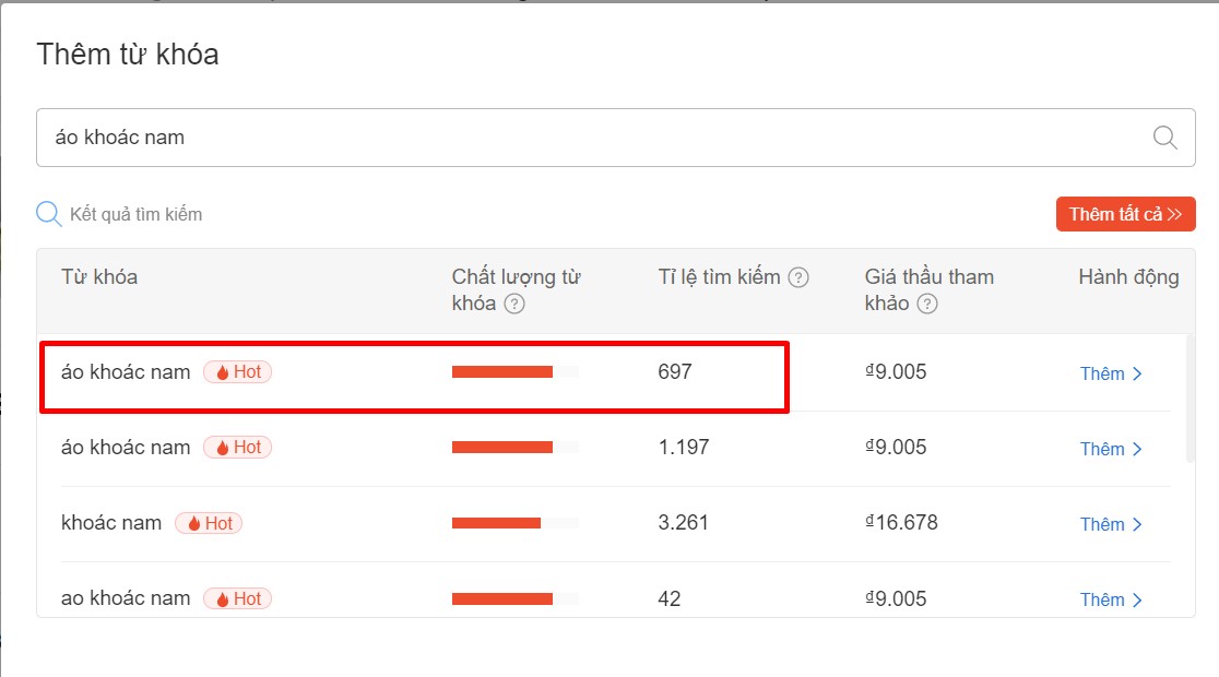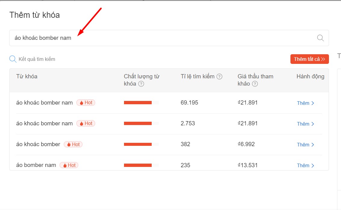 Trước hết, các bạn truy cập vào mục Thêm từ khóa để có thể bổ sung từ khóa vào quảng cáo của mình.