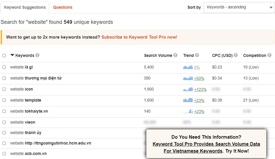 Với phiên bản Miễn phí của công cụ này, bạn cũng có thể biết được những thông số cơ bản. Tuy nhiên, nếu nâng cấp bản Pro thì bạn sẽ biết được những thông số cụ thể như Search Volume (tổng lượng tìm kiếm) và các chỉ số khác như Trend (Mức độ tìm kiếm), CPC (Giá thầu đề nghị) và Competition (Mức độ cạnh tranh).