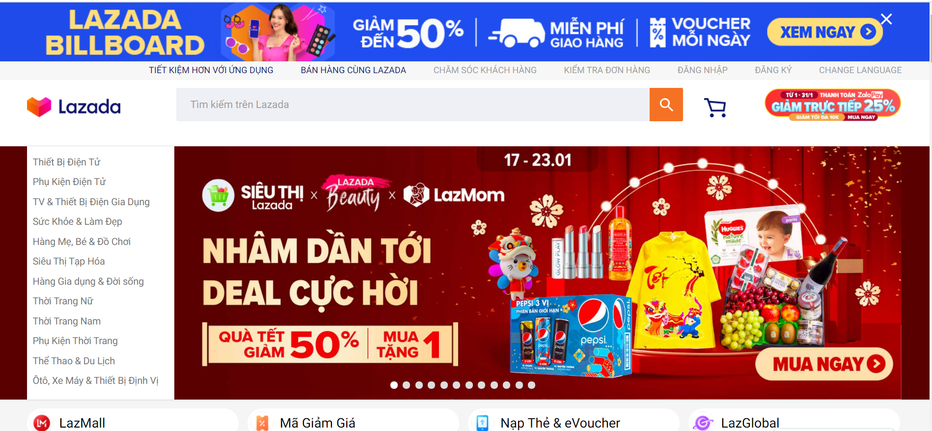 Ngay trên banner của trang chủ trên sàn Lazada đã có các gam màu ấm áp, thay đổi liên tục cùng với các chiêu thức chào mời khách hàng, đại loại như: Săn lộc đầu năm+ miễn phí giao hàng, Tết đến sale linh đình, deal tràn đầy+ Tết đến rồi đây, đậm vị Tết nhà+ Tết đến sale 50%, săn sale công nghệ chơi Tết lớn, khỏe đẹp mừng xuân,...