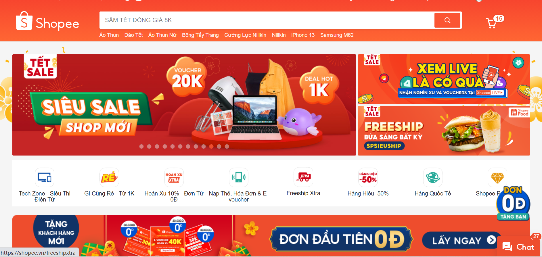 Vào những ngày này, mỗi khi mở giao diện Shopee ra, đập ngay vào mắt chúng ta sẽ là sắc đỏ và vàng, màu của sự may mắn mang đến sự thịnh vượng, tài lộc, mang đậm nét đặc sắc của không khí lễ hội ngày Tết. Trên mỗi banner động của Shopee đều có chữ Tết sale màu đỏ rõ nét trên nền trắng được tô điểm bằng vài bông hoa mai. Cũng như sàn Lazada, Shopee cũng mời chào người tiêu dùng bằng nhiều chiêu thức hấp dẫn như: Tết siêu sale, Đón Tết như ý- Điện tử sale hết ý, Rộn ràng ngàn ưu đãi- Săn giày đón Tết về, Lộc sách vàng- Xuân sale ngập tràn,...