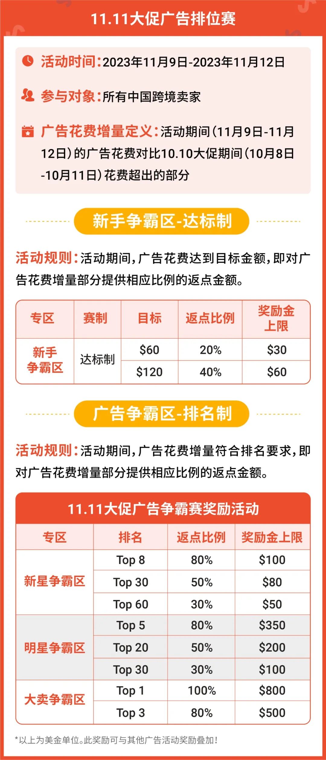 在本次广告争霸赛共设新手争霸区、新星争霸区、明星争霸区、大卖争霸区四大赛区。只要卖家的广告花费达到目标,或广告增量的排名靠前,即有机会获得最高800美金的免费广告金奖励。