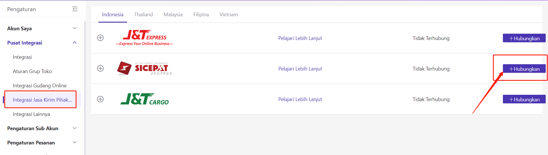 Pertama, anda perlu integrasi BigSeller anda dengan akun Sicepat Anda.