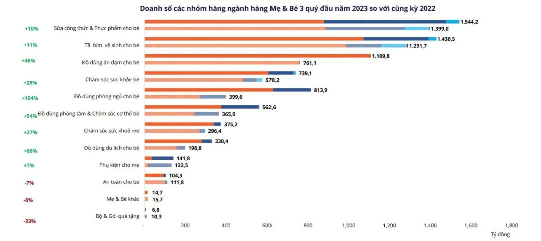 数据显示,奶粉和婴儿食品是为母婴行业带来收入最大的产品,9 个月内收入 1.54 万亿越南盾,比去年同期增长 10%;其次是婴儿尿不湿,销售额为 1.43 万亿越南盾,增长 11%;排在第三位的是婴儿喂养用具,价值 1.11 万亿越南盾,增长 46%。