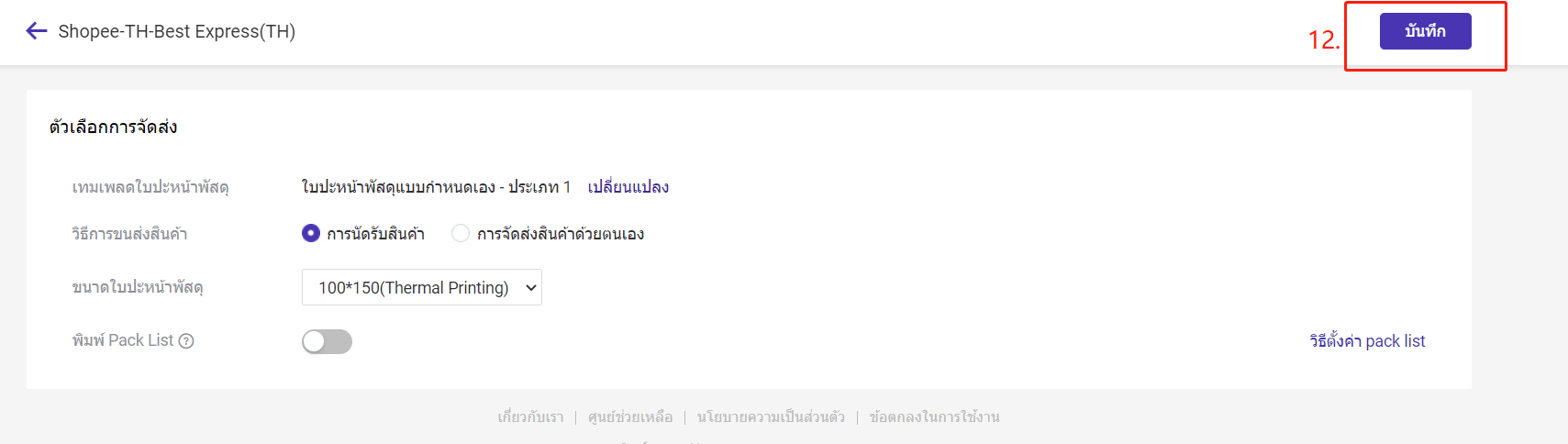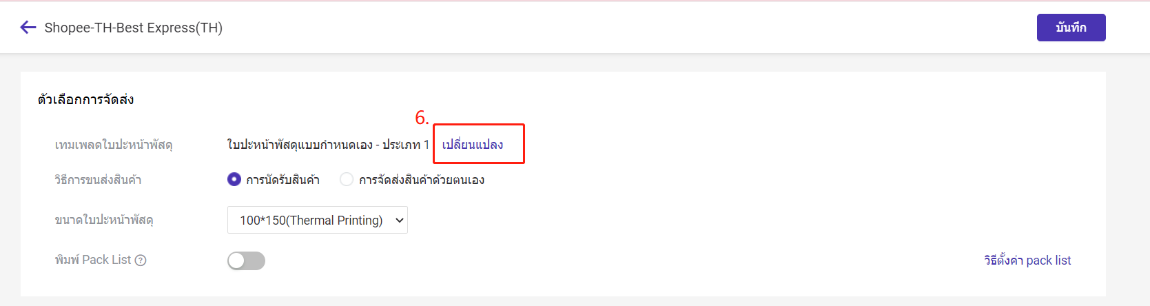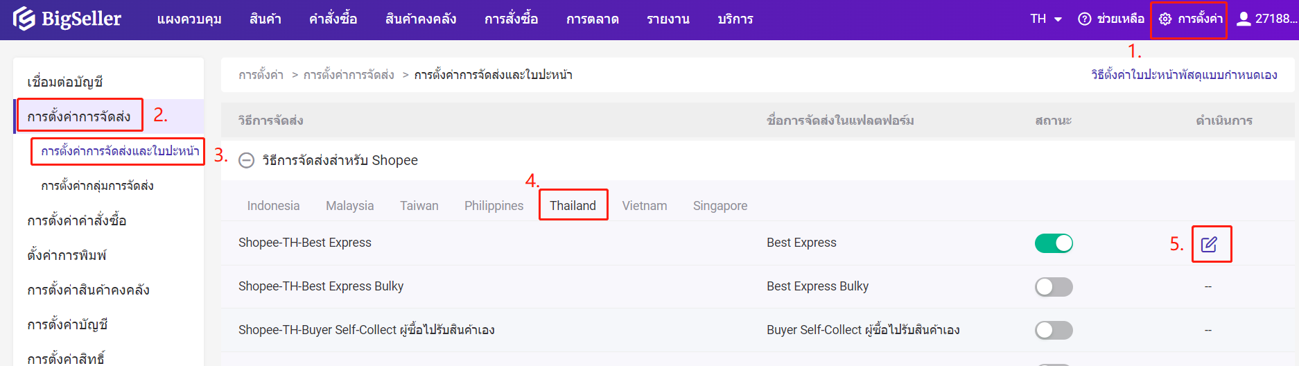 ขั้นตอนที่ 1 การตั้งค่า > การตั้งค่าการจัดส่ง > วิธีการจัดส่งสำหรับ Shopee > Thailand > แก้ไข
