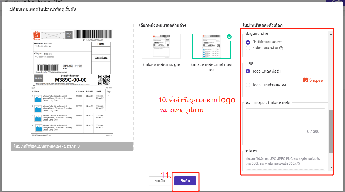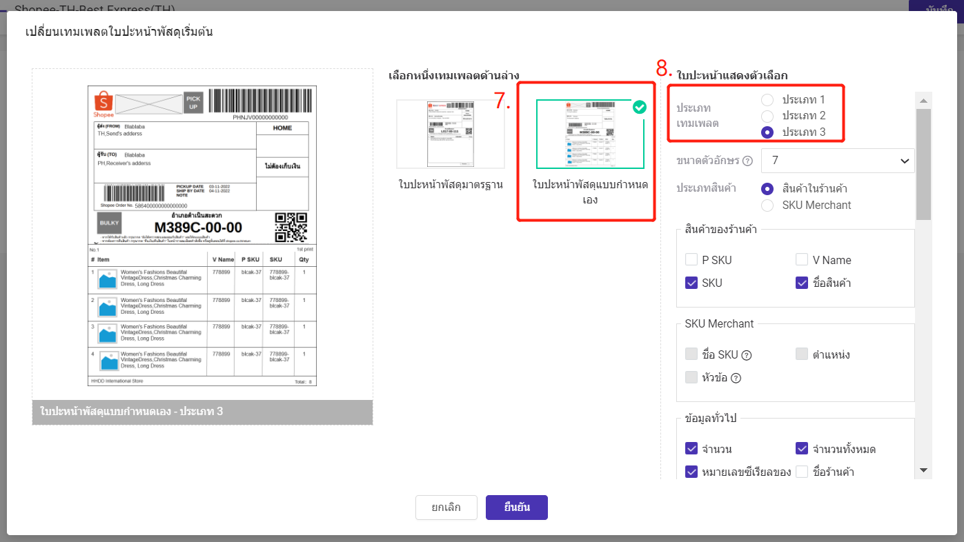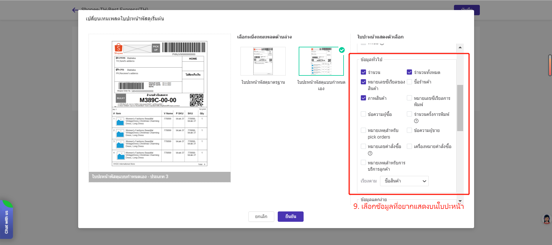 ขั้นตอนที่ 2 คลิก เปลี่ยนแปลง > เลือก ใบปะหน้าพัสดุแบบกำหนดเอง > เลือกประเภทแม่แบบ >เลือกข้อมูลที่อยากแสดงในใบปะหน้าพัสดุ > ยืนยัน