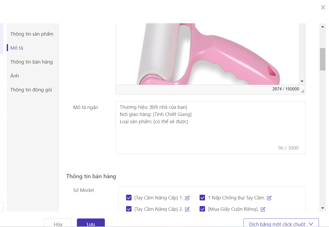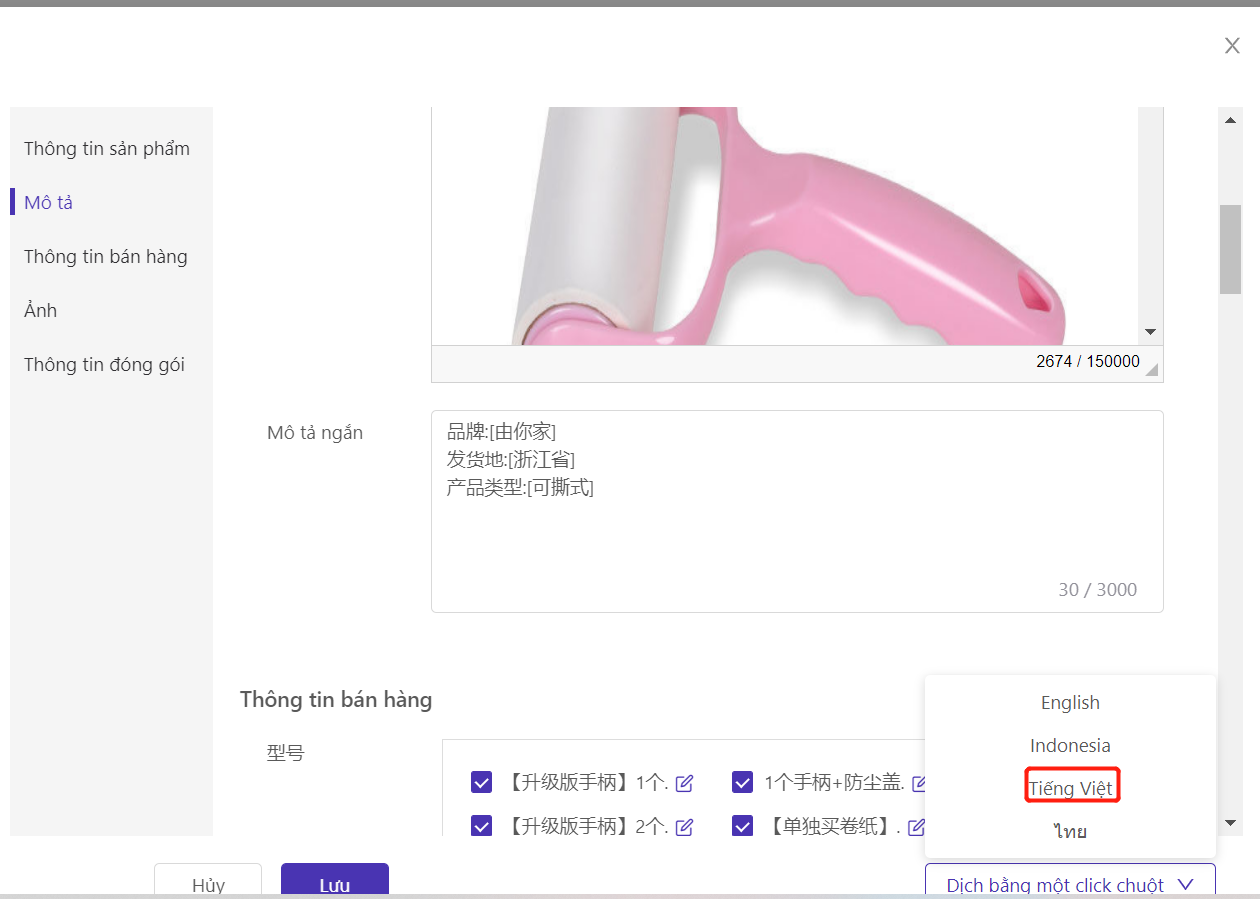 Sau khi đã sao chép sản phẩm, chúng ta vào trang chỉnh sửa và bấm nút Dịch bằng một click chuột để chuyển đổi ngôn ngữ tiếng Trung sang tiếng Việt, sau khi bấm vào nút đó, chưa đầy 1 giây sau thì toàn bộ tên sản phẩm, mô tả sản phẩm, phân loại các thứ từ tiếng Trung biến thành tiếng Việt, thật sự tiện lợi và tuyệt vời cho các nhà bán hàng, không cần bạn phải mở Google dịch để copy và dán dịch từng đoạn, tiết kiệm được nhiều thời gian và công sức trong việc đăng sản phẩm là mục đích chính của BigSeller, chúng tôi luôn mong muốn được đồng hành cùng các bạn trong thế giới bán hàng đa kênh đa shop.