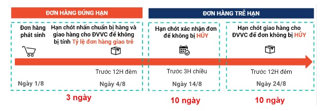 • Nếu Shop giao hàng ra cho vận chuyển sau thời gian chuẩn bị hàng quy định thì đơn hàng sẽ bị tính vào Tỉ lệ giao hàng trễ của shop.